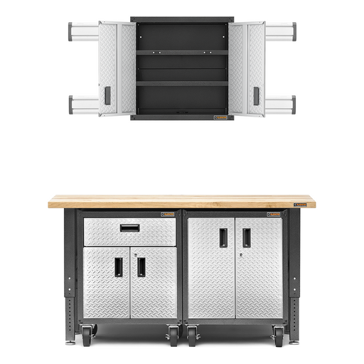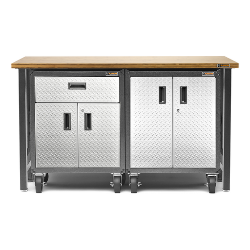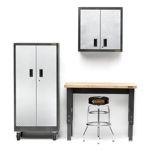 View Full DetailsCreate a functional workspace with Gladiator’s easy-to-assemble system. Durable steel cabinets feature Silver Tread Plate doors, while the 6' work...