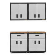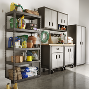 This Gladiator GarageWorks Ready-to-Assemble (RTA) storage system is an excellent choice for DIY enthusiasts looking to build a customized garage setup. It includes two 28-inch Wall GearBoxes for overhead storage, two 3/4-door Modular GearBoxes for flexible, accessible organization, and two durable hardwood worktops designed for the base cabinets. Together, these components create a versatile and functional workspace that helps maximize storage, improve organization, and make efficient use of garage space.